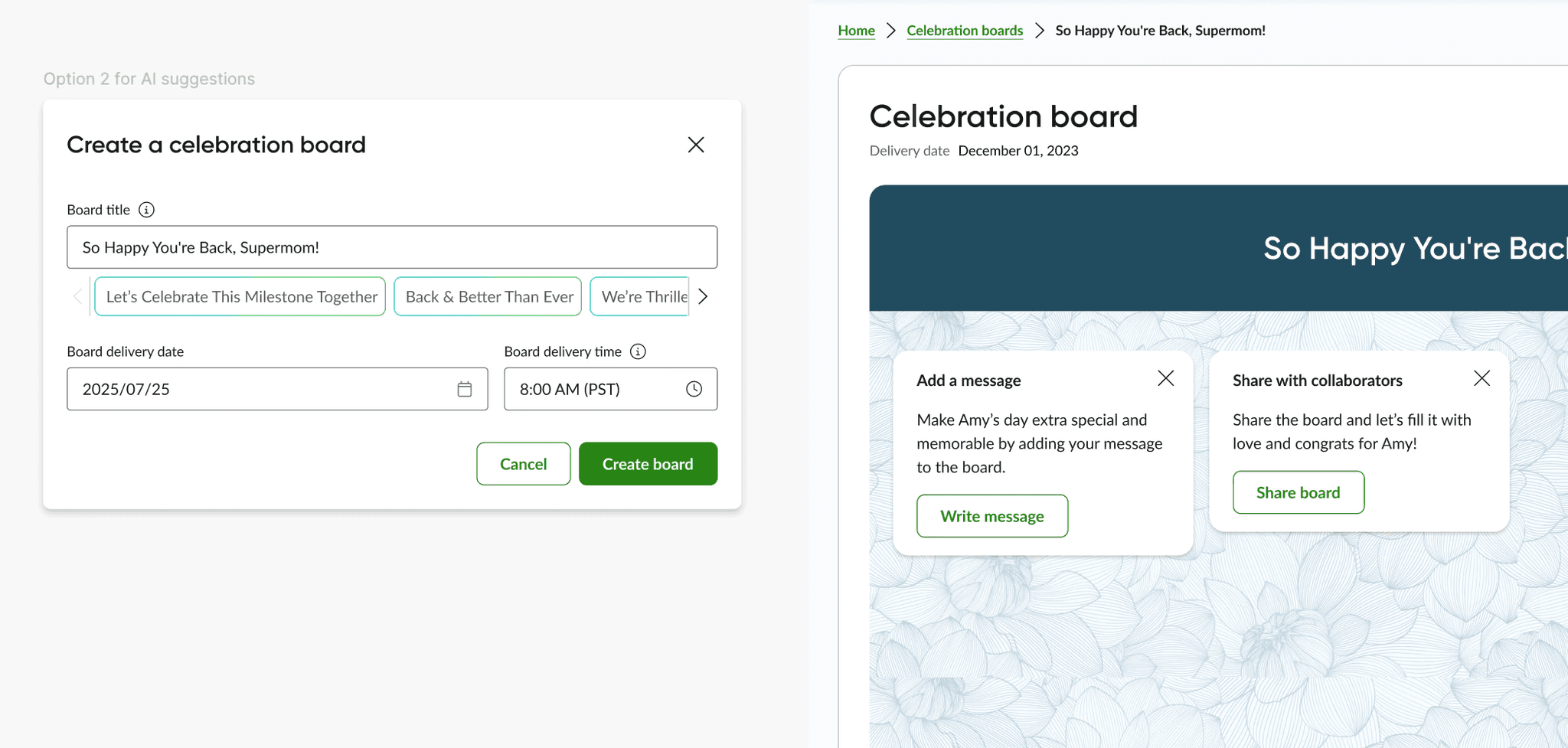 Once on the board, users see clear, task-based guidance, e.g., “Add your message,” “Invite collaborators.” Collaborators also receive AI-suggested messages and visuals based on their prompts and occasion, making participation simple and heartfelt.